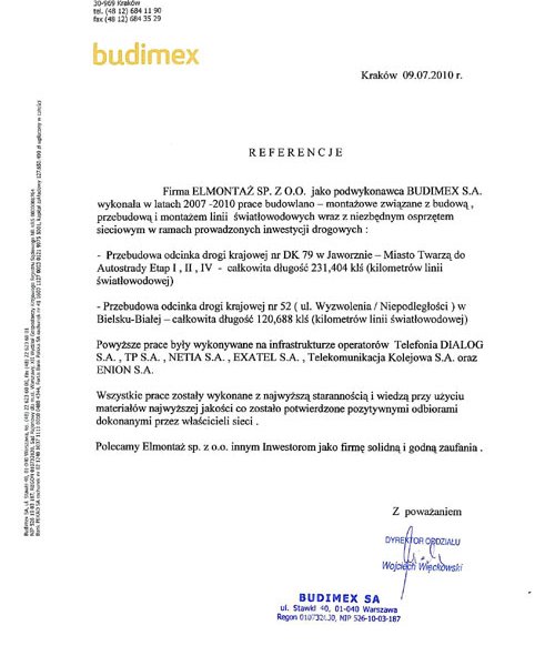 | Budowa i przebudowa oraz montaż linii światłowodowych wraz z niezbednym osprzętem sieciowym w ramach prowadzonych inwestycji drogowych. |