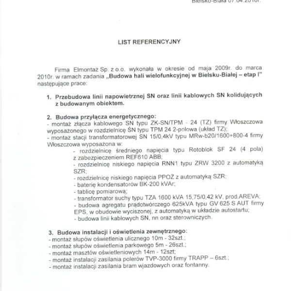 | Prace pomiarowe przy urządzeniach i sieciach elektroenergetycznych na poszczególnych obiektach zakładu Teksid Iron Poland Sp. z o.o. |